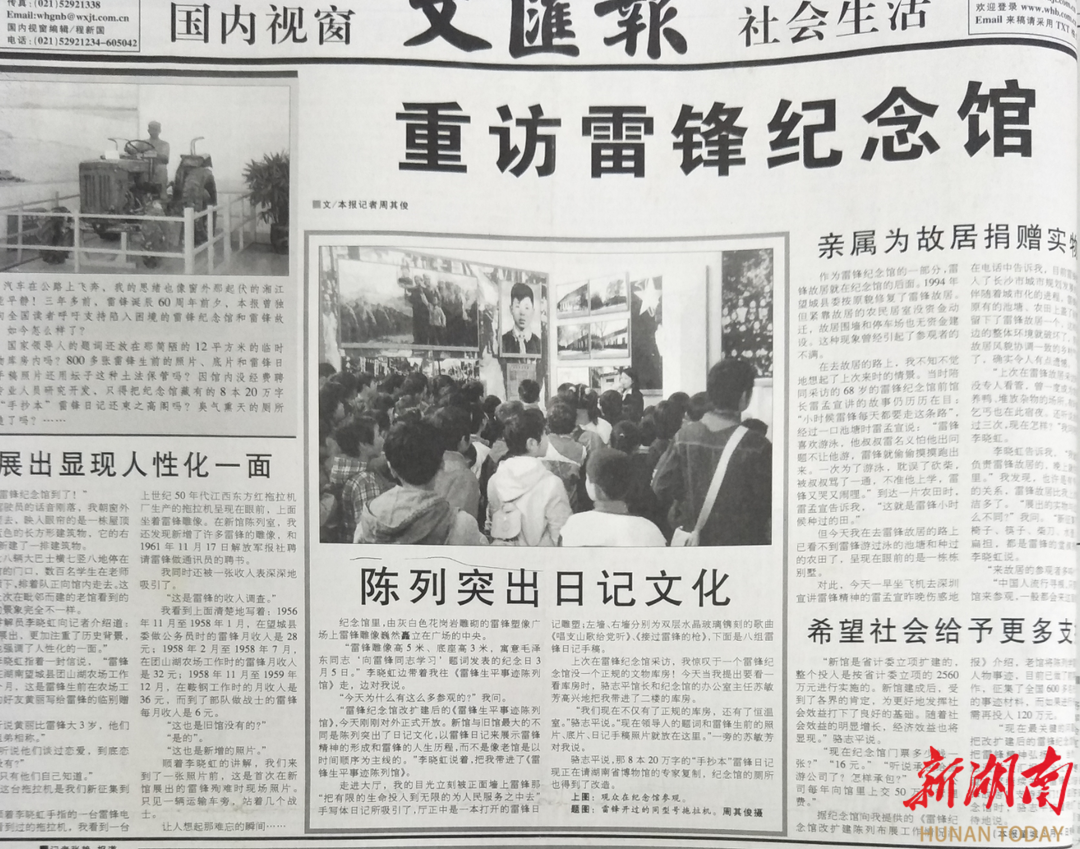 2003年3月5日,是毛泽东等老一辈无产阶级革命家发表向雷锋同志学习题词四十周年纪念日,提质后的雷锋馆正式亮相,其俊记者特地从上海《文汇报》赶过来,围着馆区转了好几圈,说到动情处,眼睛中泛出了泪花。那一刻,我才意识到,其俊记者为雷锋馆出了不少力,但没从雷锋馆拿取半分钱报酬,馆里也没请他吃过一顿像样的饭。