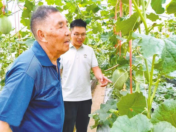 今年7月,罗官章(左)在大棚查看作物长势。受访者供图